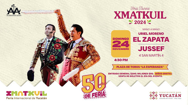 La empresa Toros Yucatán que dirigen los señores Alberto Basulto Soberanis y Alberto Hagar Goff, ha dado a conocer los carteles de los tres festejos taurinos que se llevarán a cabo en la plaza de Toros portátil "La Esperanza" instalada en la localidad de Xmatkuil, (Mérida), Yucatán, en el marco de la tradicional Feria Yucatán Xamatkuil 2024, que festeja su 50 aniversario.
